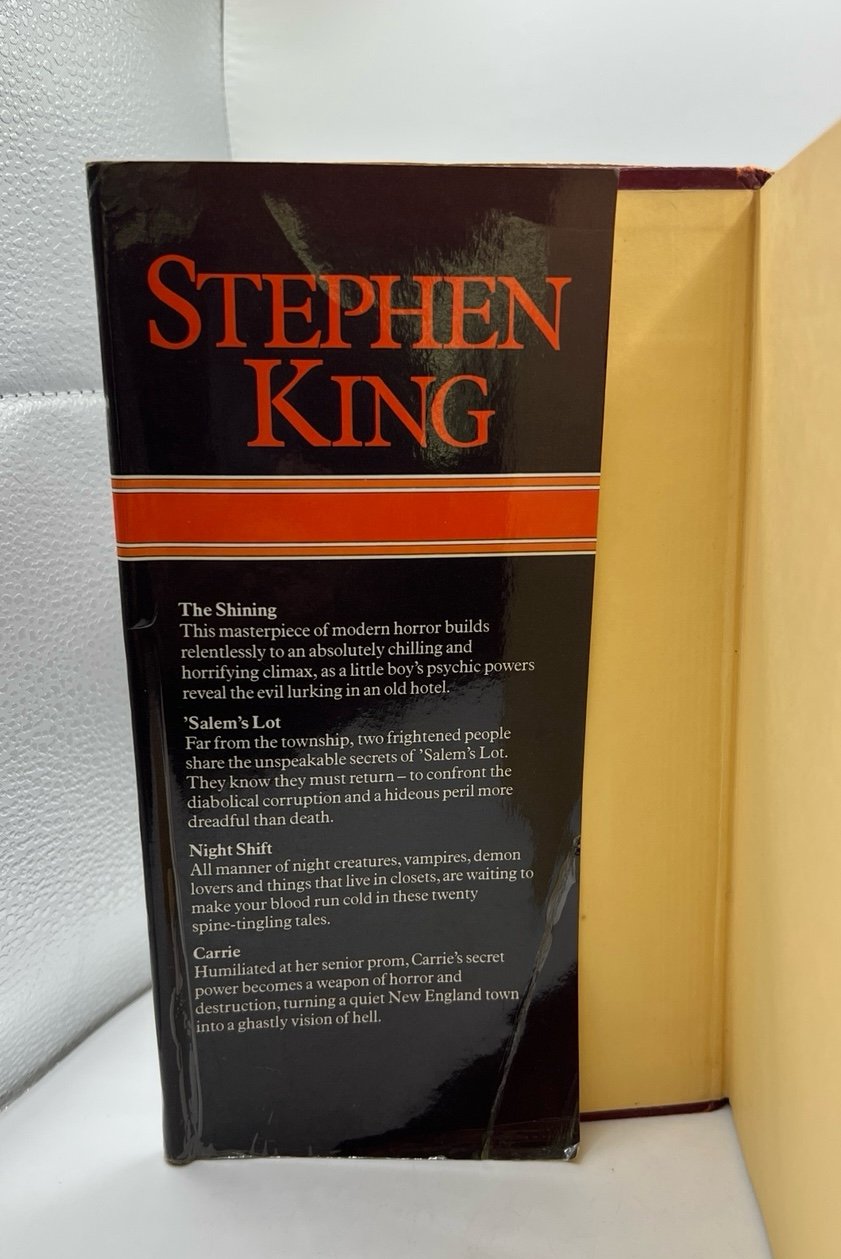 Good pre-owned Stephen King 4 in 1 HCDJ 1985 complete and unabridged novels~The Shining, Salem's Lot, Night Shift, Carrie. Cover edge wear near spine top and bottom. Handling/storage marks.. Binding is tight. No tears, creases, missing pages, writing, underlining or highlighting except as previously noted. See photos for condition.