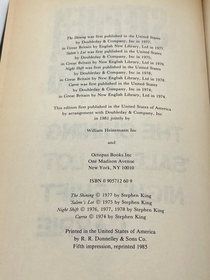 Stephen King The Shining, Salem's Lot, Night Shift, Carrie HCDJ Book 4 in 1 1985 Octopus/Heinemann