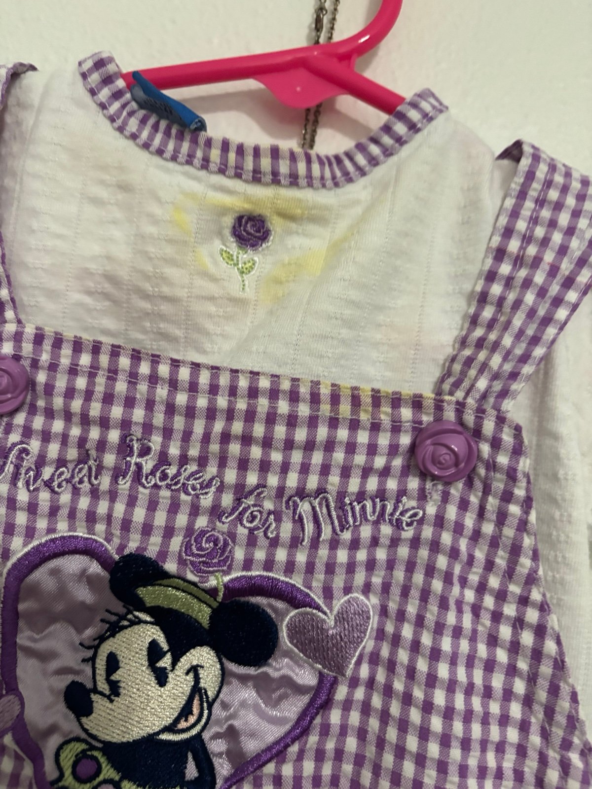 • minnie shortalls tagged 12m does have two yellow stains around the neck (see 6th slide for flaws)