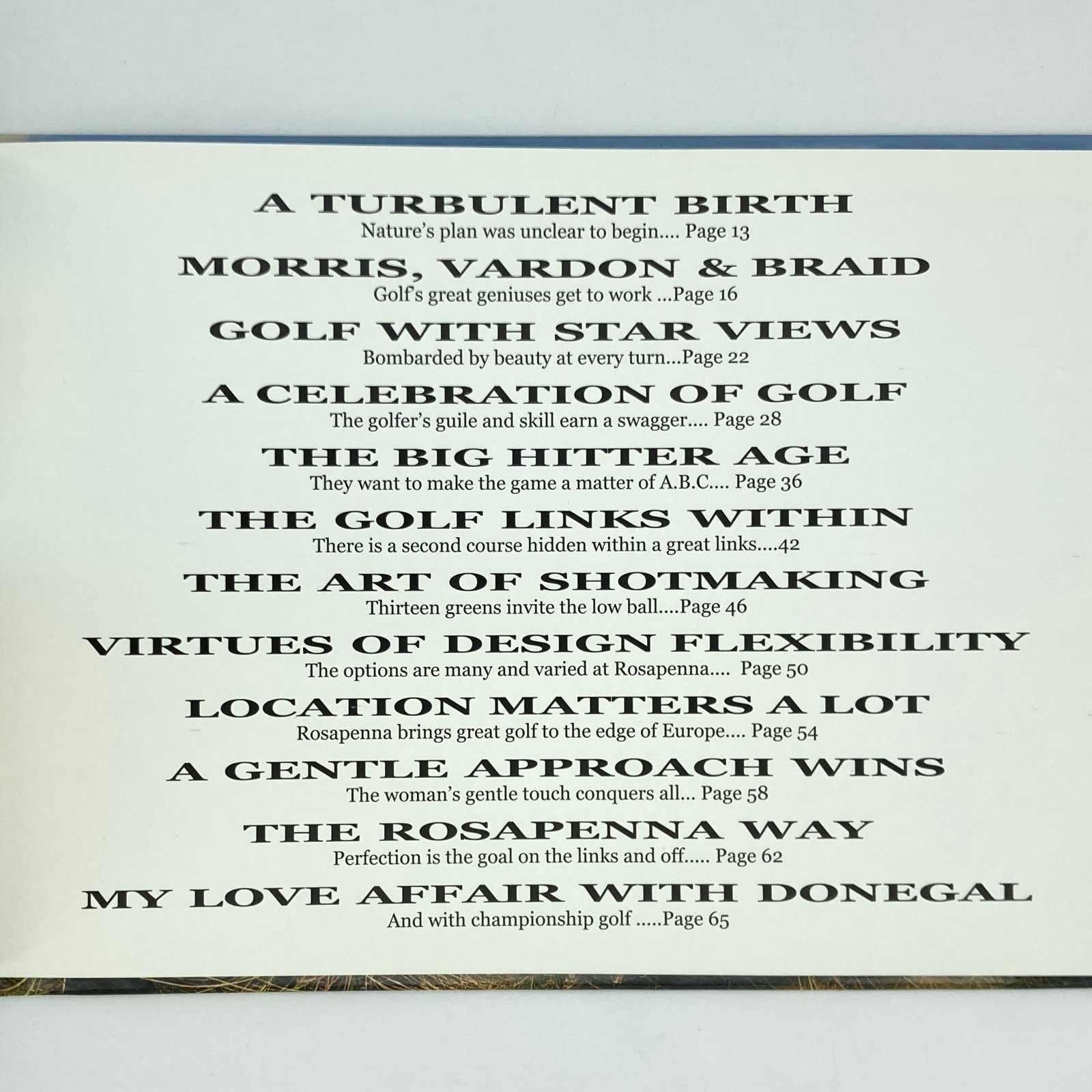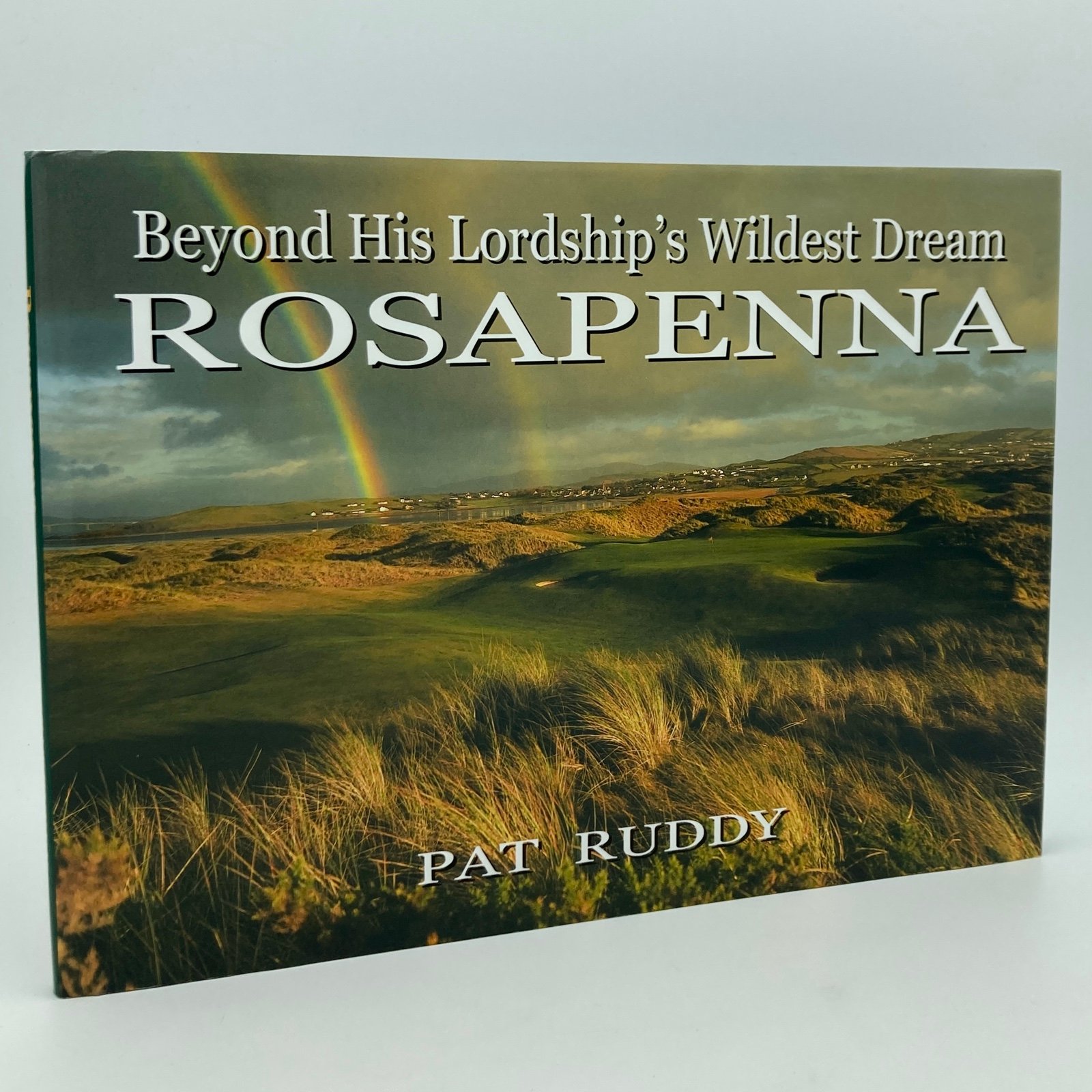 First edition (print number not stated) hardcover copy of Rosapenna: Beyond His Lordship’s Wildest Dream by Pat Ruddy (Ruddy Golf Library, 2013). A beautiful photographic journey through the iconic and historic Irish golf club and resort, originally conceived in the late 1800s. A clean copy with mild rubbing/scuffing to jacket faces and shelf wear around the edges. Boards are straight and clean but with corners bumped. Binding is firm and spine is straight. Glue from binding visible through rear endpaper, appears to be purely cosmetic and does not affect binding strength. Faint waviness to outer edges of text block, likely from a small bit of humidity exposure. Otherwise all pages are clean and unmarked. See photos for condition.
