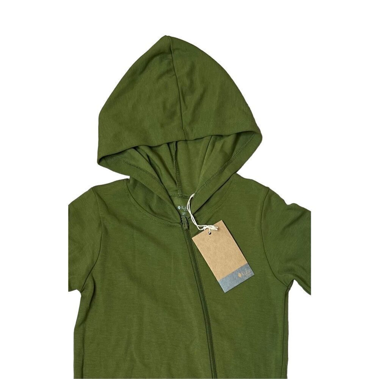 NWT Kyte Baby Infant Olive Green Hooded Jersey Romper Bamboo Long Sleeve 2T. Buttery soft Bamboo and durable. All season fabric, anti-microbial, organic, stretch, temperature controlling, breathable, cooler than cotton, moisture wicking and allergenic. 97% Bamboo Rayon 3% Spandex. Machine washable. Item in excellent NEW condition. No known rips, tears, holes, stains or defects.