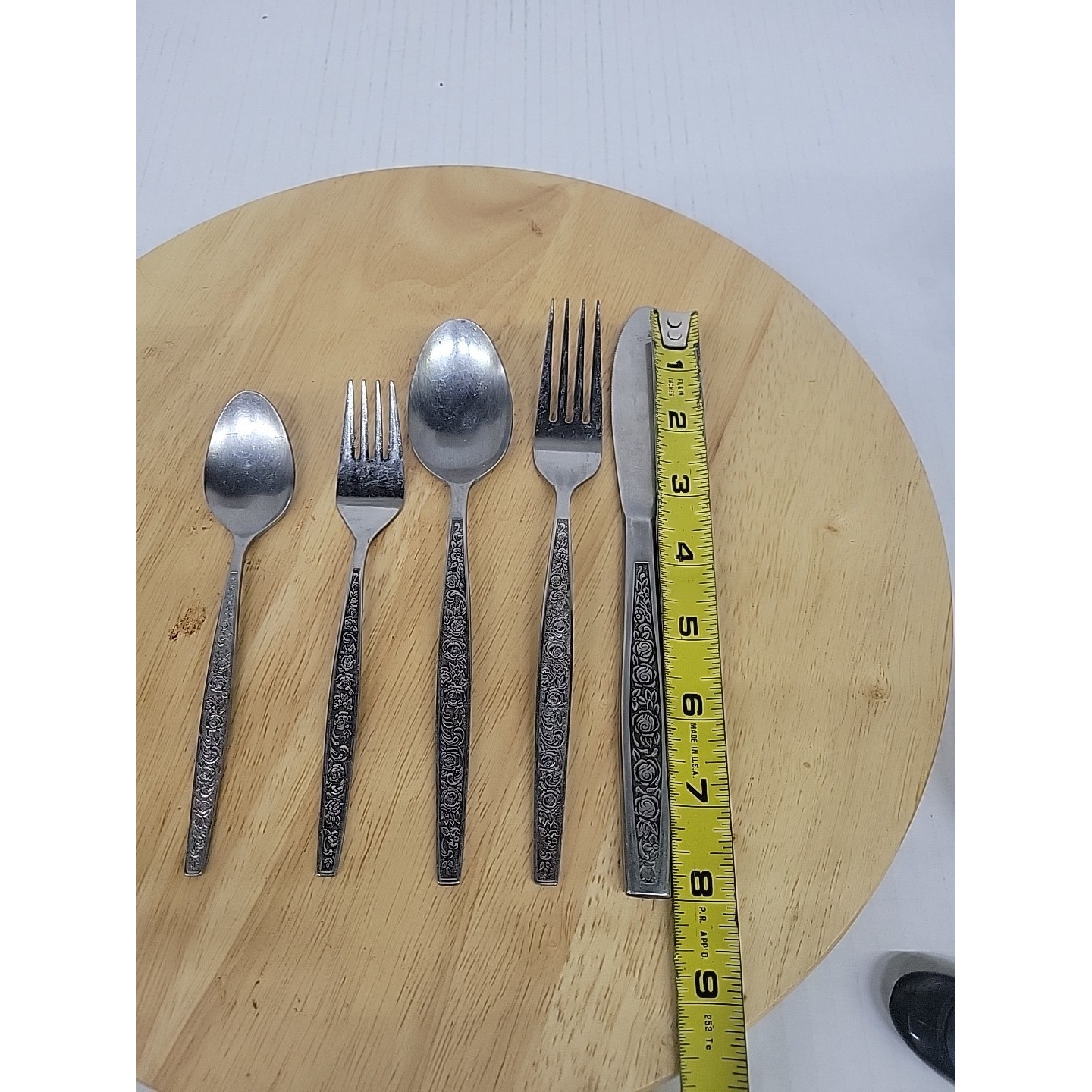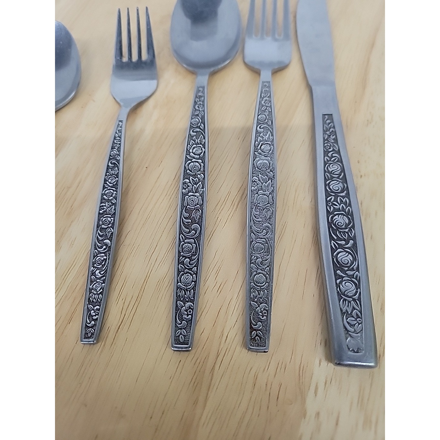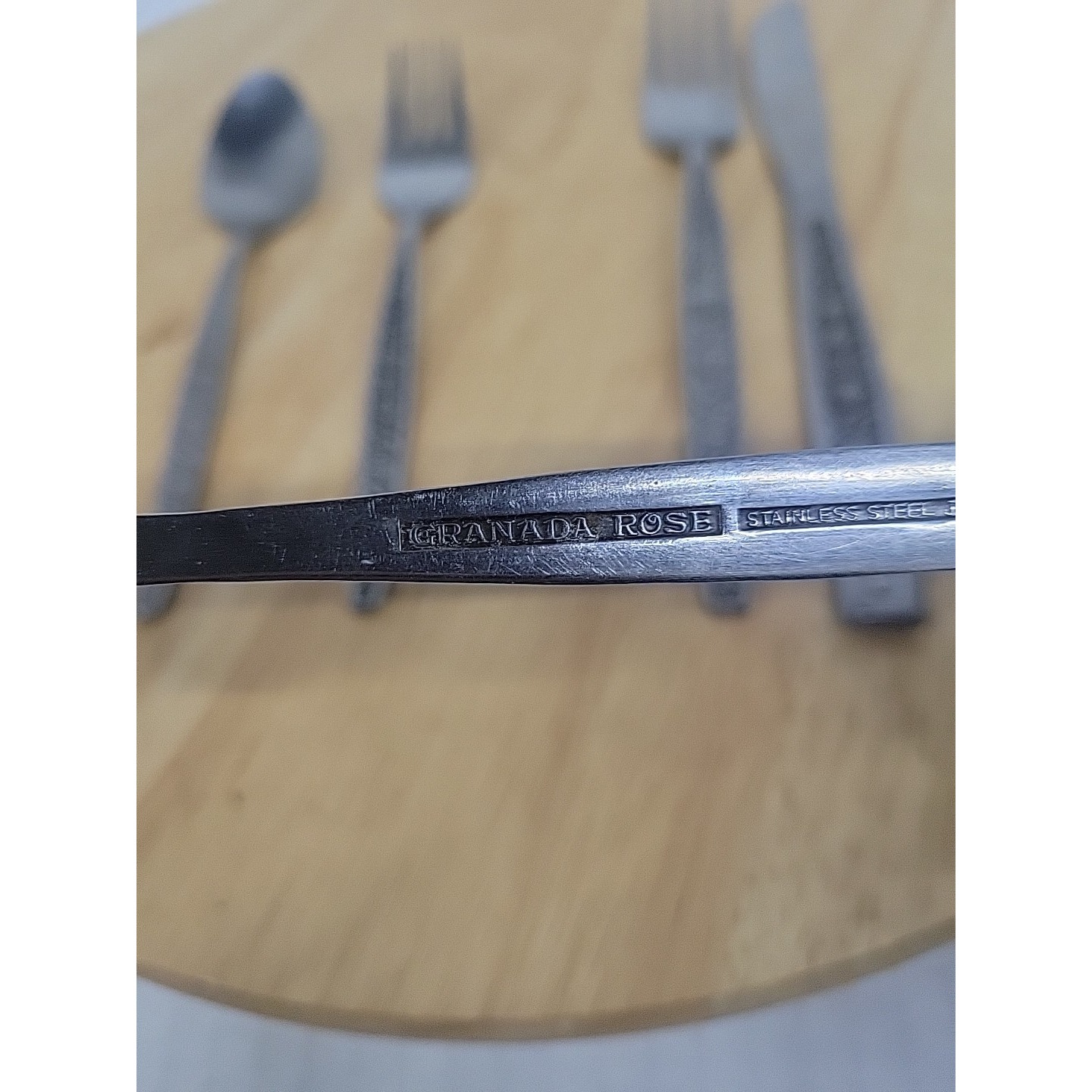 The Vintage Granada Rose Stainless Steel MCM 5 Piece Flatware Set features a unique pink color and elegant design, perfect for adding a touch of retro charm to any kitchen or dining table. Please check photos for condition as some are faded. This set includes knives that are ideal for everyday use or as a collectible piece for vintage lovers. The combination of stainless steel and the distinctive Granada Rose pattern makes this set a standout addition to any flatware collection.