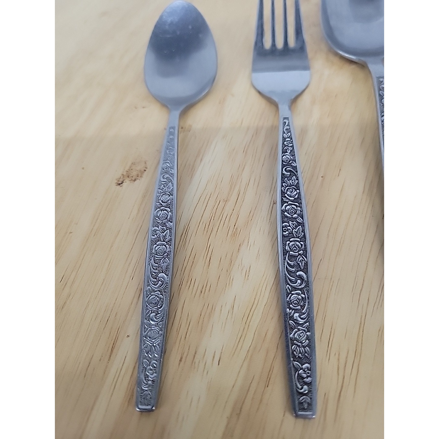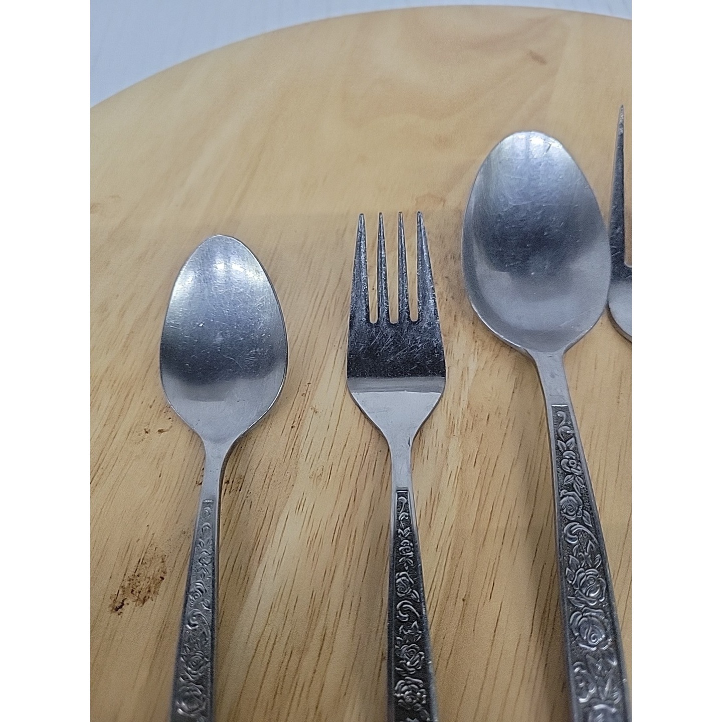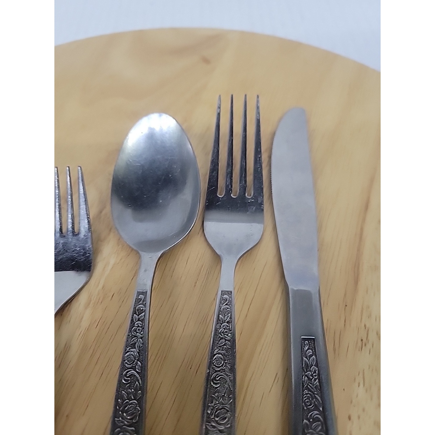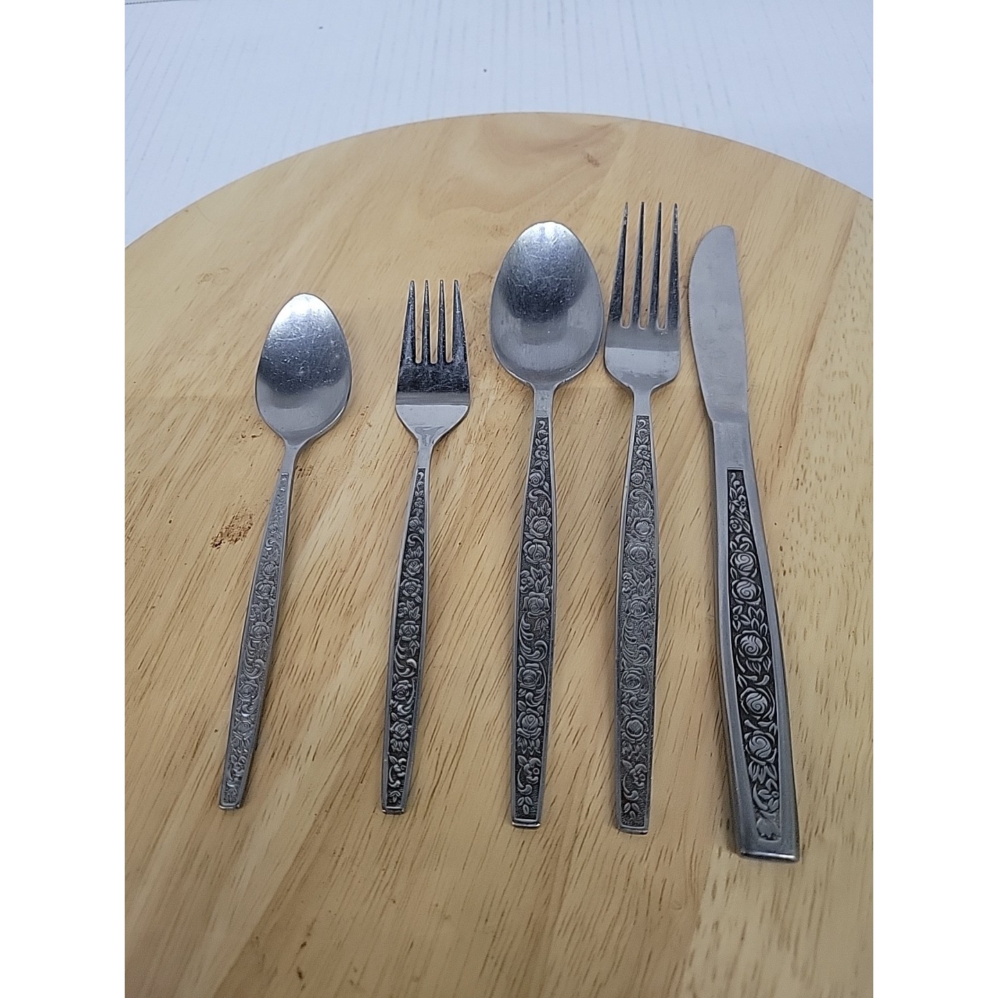 The Vintage Granada Rose Stainless Steel MCM 5 Piece Flatware Set features a unique pink color and elegant design, perfect for adding a touch of retro charm to any kitchen or dining table. Please check photos for condition as some are faded. This set includes knives that are ideal for everyday use or as a collectible piece for vintage lovers. The combination of stainless steel and the distinctive Granada Rose pattern makes this set a standout addition to any flatware collection.