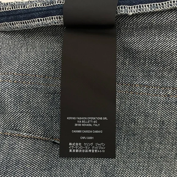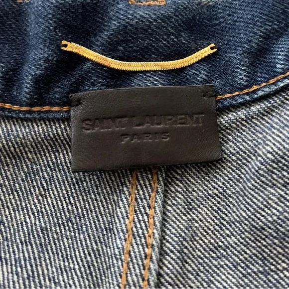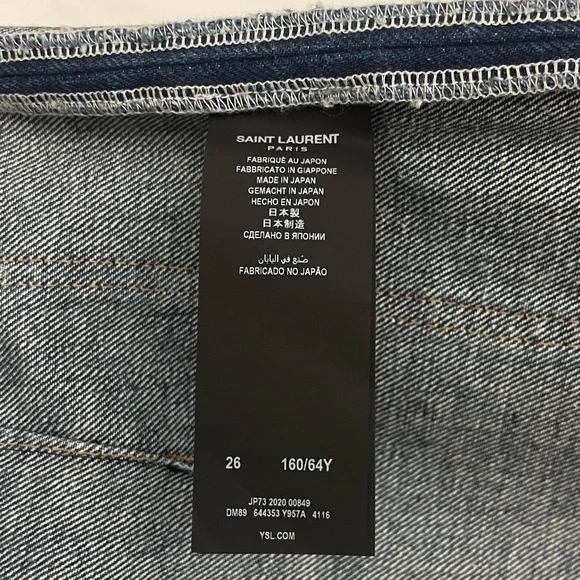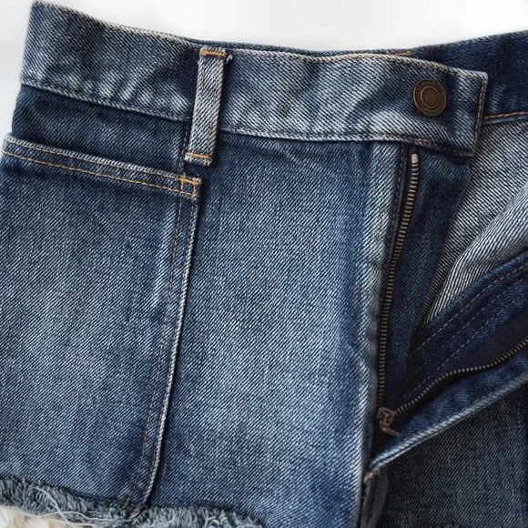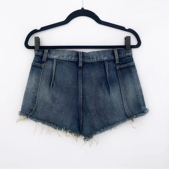 SAINT LAURENT - Frayed Denim Shorts (Brand New)New, never worn, no tagsSize: 26Color: Mid-blueMaterial: 100% CottonStyle: high waisted, mini lengthFrayed edgesContrast stitchingOversize patch pockets to front and backFront button closure and zip fasteningDimensions below were taken by me, and are of the actual item available for purchase. Measured one side, laying flat (double for total circumference where applicable). Waist: 14.5" Front Rise: 11.25" Back Rise: 13" Inseam: 1" Outseam: 10.25"Care instructions: Dry CleanMade in Japan