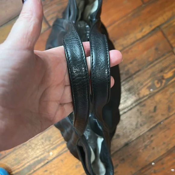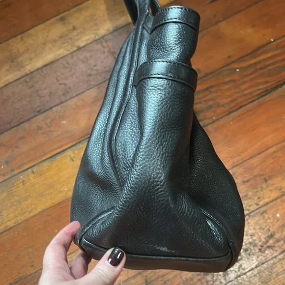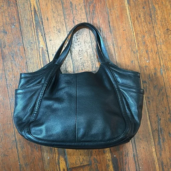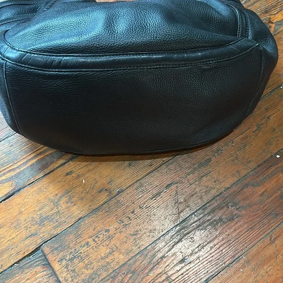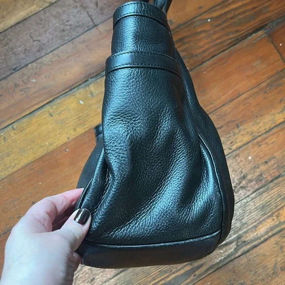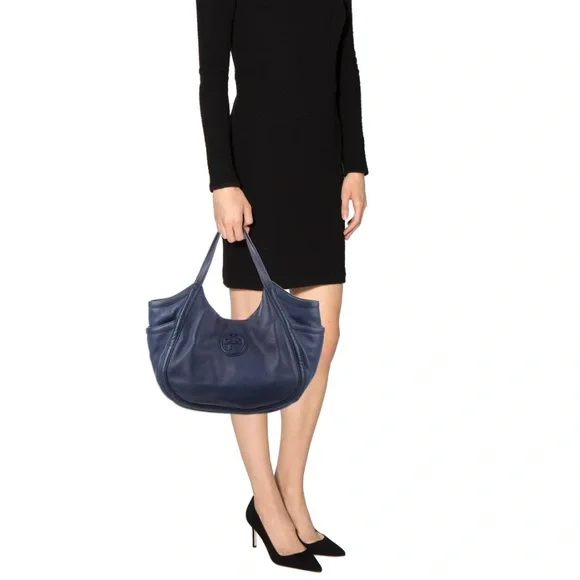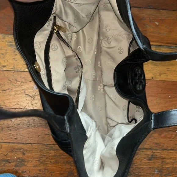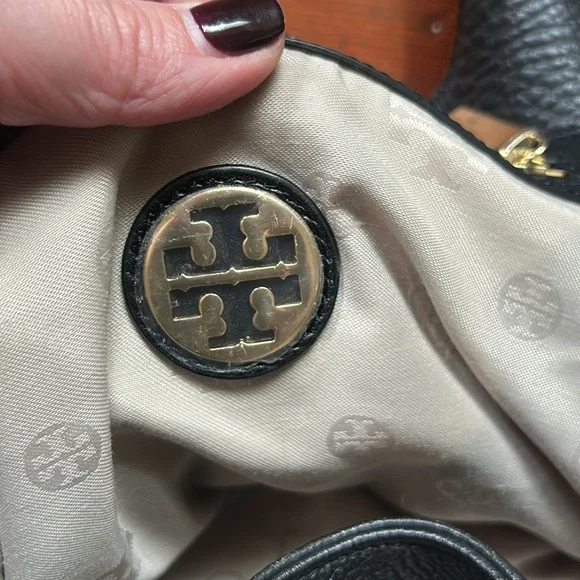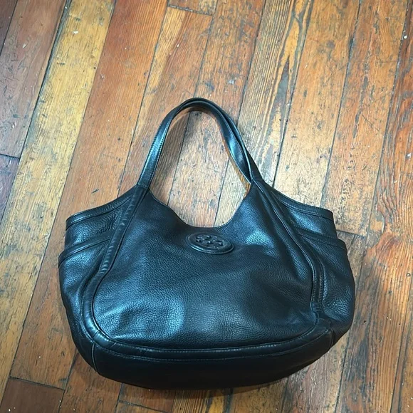 This Tory Burch shoulder bag features a luxurious black pebbled leather design, offering a sophisticated and versatile accessory. Its slouchy silhouette and continuous curved strap provide a classic yet casual look, perfect for any occasion. The iconic Tory Burch logo medallion adds a touch of elegance to this roomy and stylish bag.Gently used. Has minor wear. Please look at all pictures.