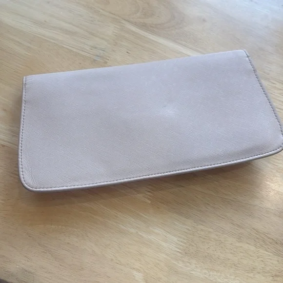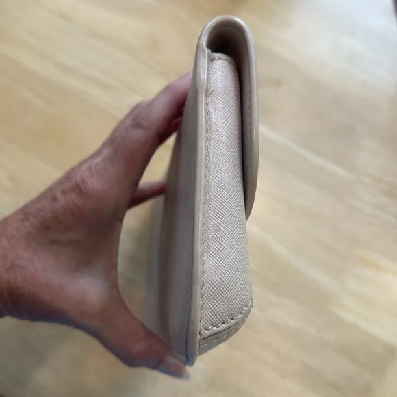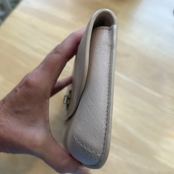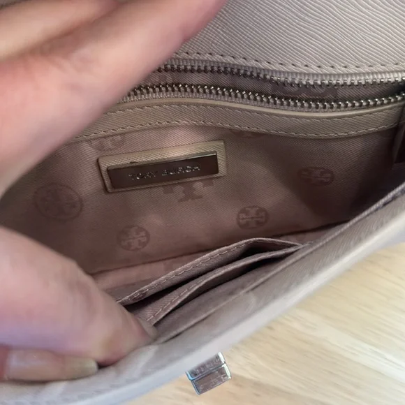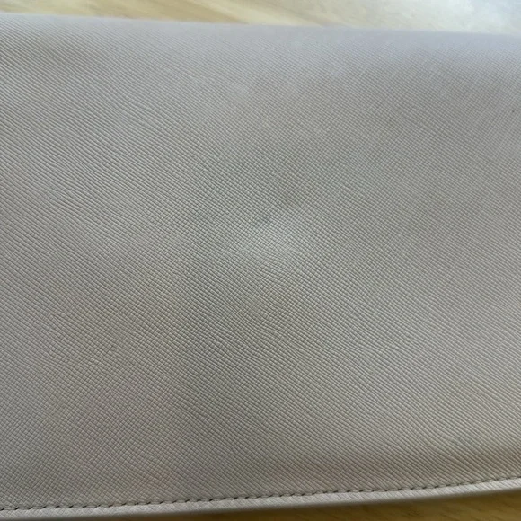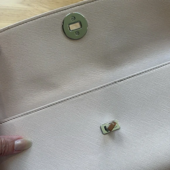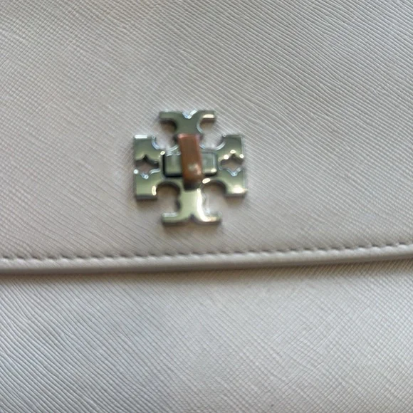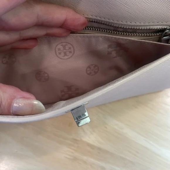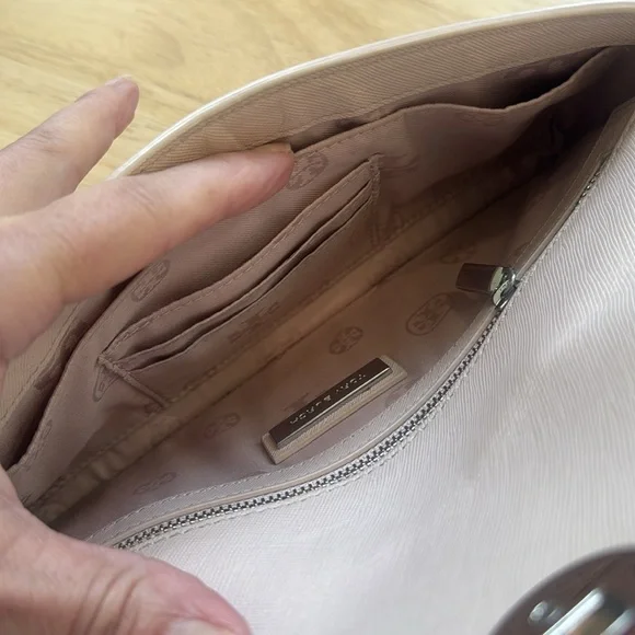 Thanks to its elegant, minimalist design, this slim saffiano leather clutch from Tory Burch is an ideal evening accompaniment.Product FeaturesTurnlock closureInterior zip pocket, interior cell phone pocketFull logo lining11.25WX 1"D x 5.5HSaffiano leather; lining: logo-print polyester. Two minor flaws only on the exterior. Turn lock shows some tarnish and on the back is one minutefaded pale blue stain. This little bag is immaculately clean on both the exterior and interior.
