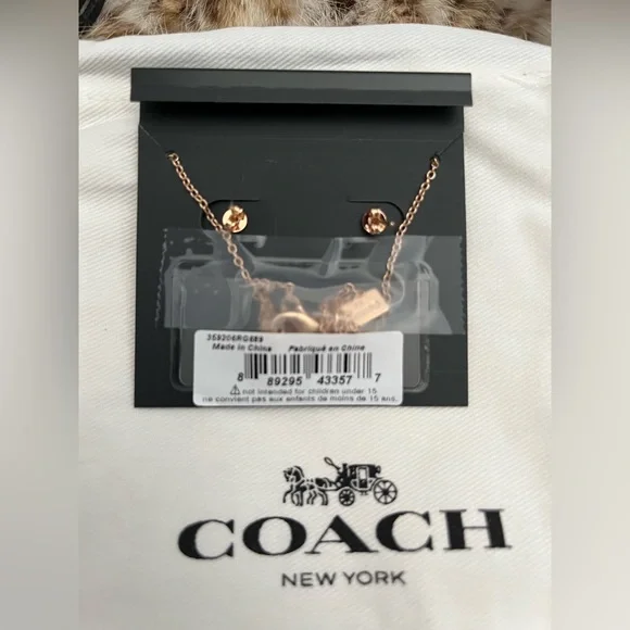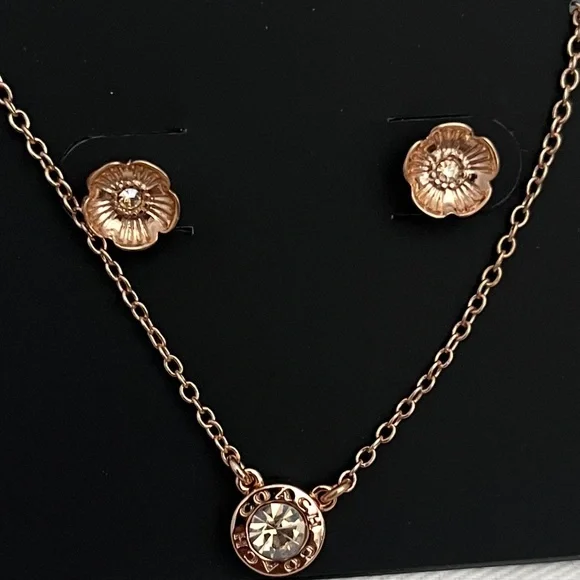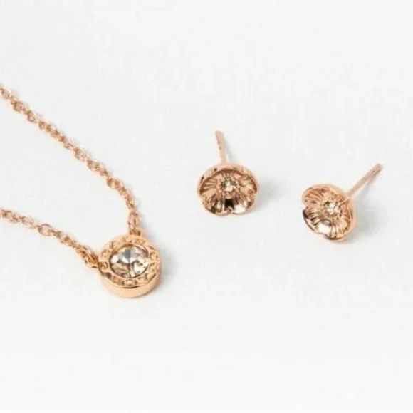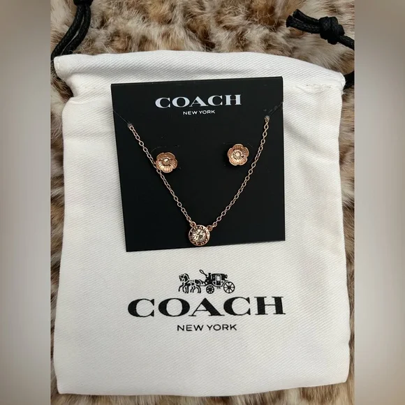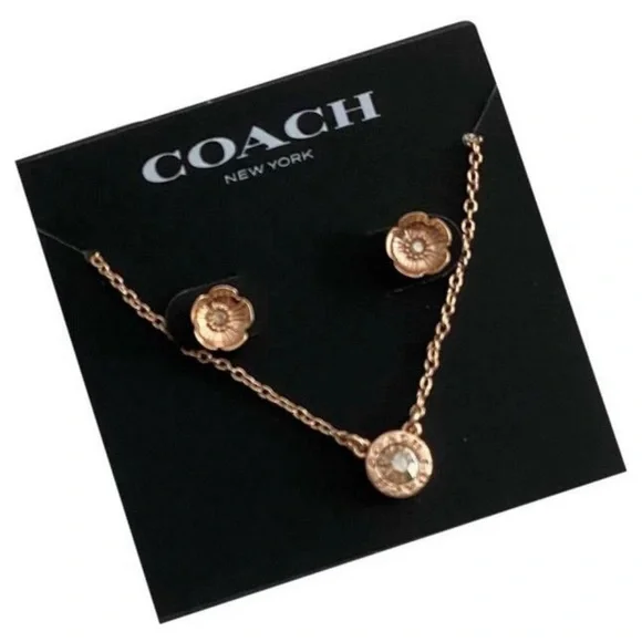 COACH 89295 43357 Tea Rose Earring & Necklace Set - [ ] New in pouch - [ ] Plated brass- [ ] Lobster clasp closureNecklace: adjustable 16" - 18" (L)Earrings: 1/4" (L) x 1/4" (H)- [ ] Thisjewelry set includes Tea Rose stud earrings and a Coach solitaire pendant necklace. Finished with glittering crystal stones, wear them together or separately.- [ ] Please remember that due to the differennces in monitors, colors may vary and sharpness. Please see all photos and feel free to ask any questions. Smoke free and clean home. After photographs are taken,Items are stored in plastic. All purchases will be shipped out next business day; Unless notified otherwise. Thank You, TC