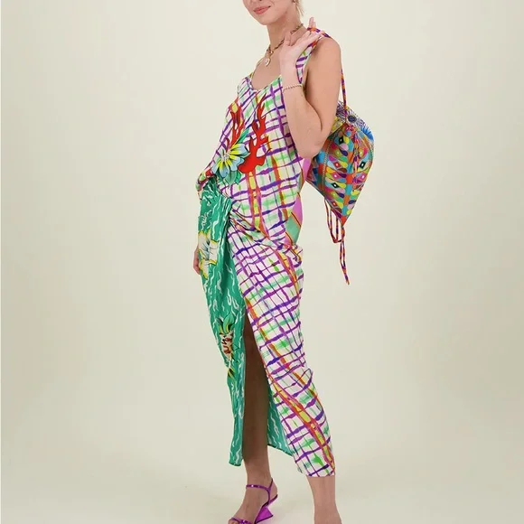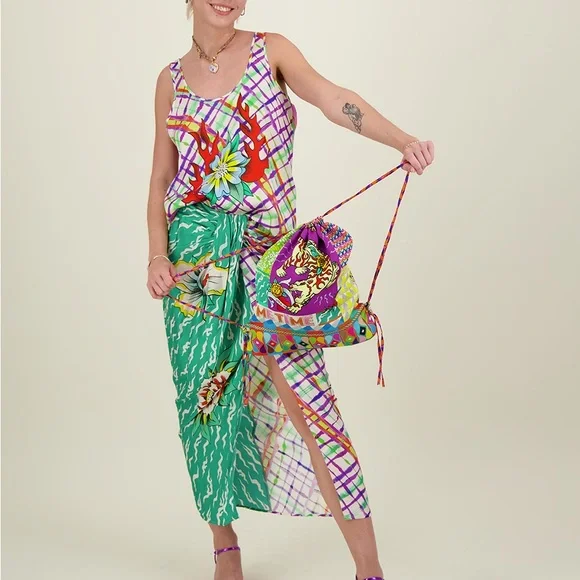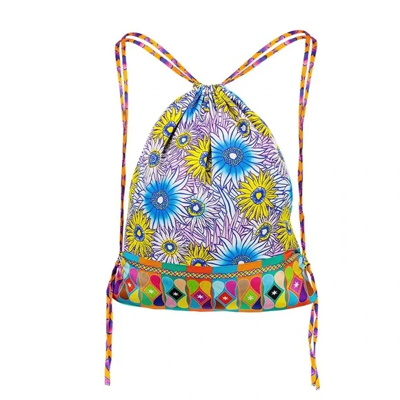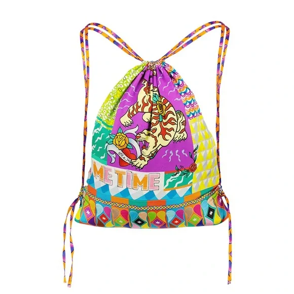 Vibrant drawstring backpack with a playful design. Features a mix of purple, yellow, green, and blue colors.Very cute drawstring bag in mixed print geometric design in a patchwork style. Beautiful stylized tiger in front. Reads “Me Time”. Back of the bag is a blue and yellow floral pattern. Bottom of the bag is a contrasting geometric print. Wear this bag with any of our matching clothes for a fun boho chic look. 100% Viscose. Washable.
