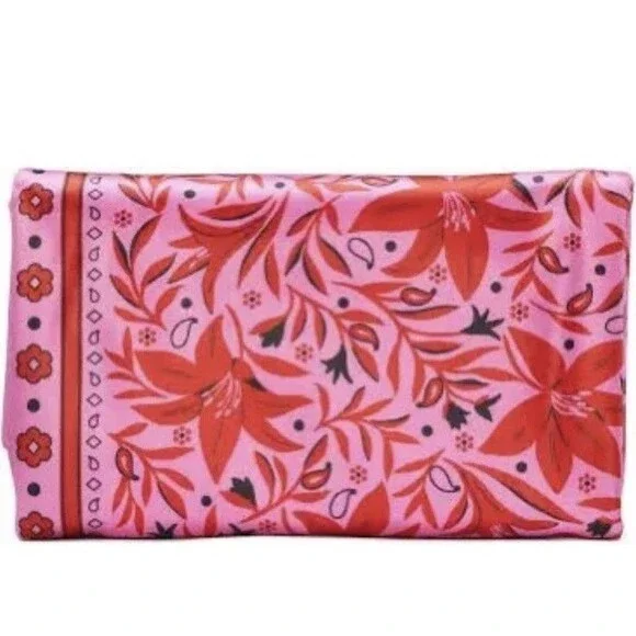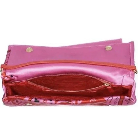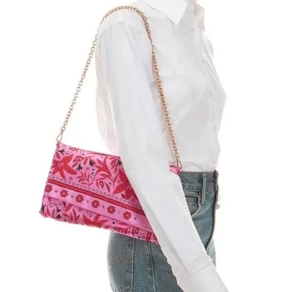 Style NumberKG990MeasurementsLength: 1.5"Height: 6.25"Width: 10.5"MaterialsSatinFaille liningStrap12-inch strap drop lengthFeaturesInterior zip pocket; interior slip pocketMagnetic tab closureFits iPhone Max, zip-around continental walletPinmount logoDetachable chain shoulder strapNew in packagingThanks for looking