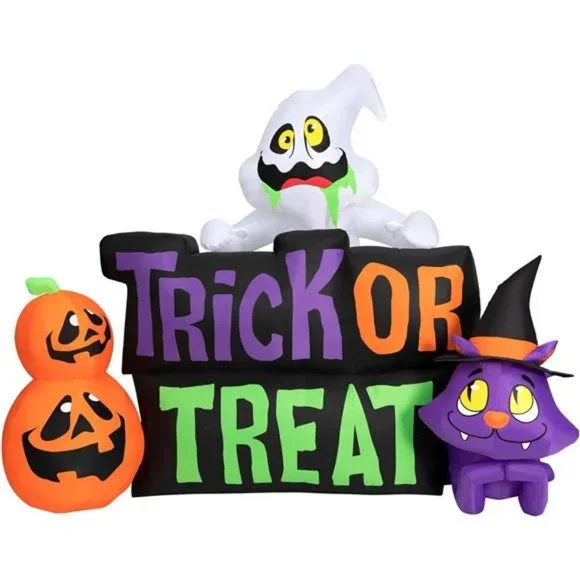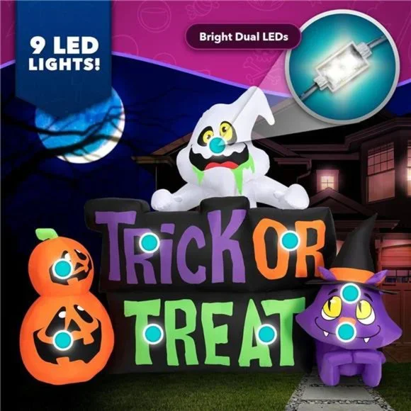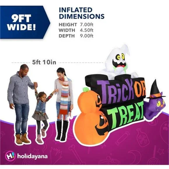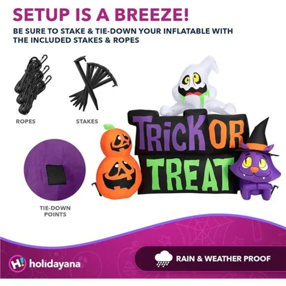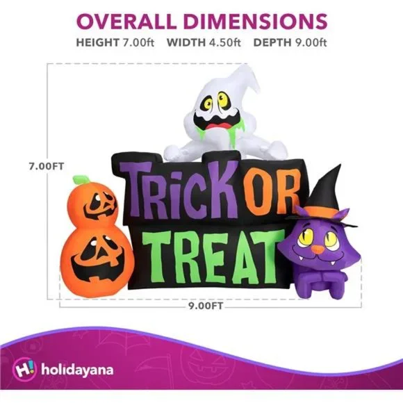 🧿MASSIVE INFLATABLE HALLOWEEN DECORATIONS: Standing impressively at 9 ft Wide when fully inflated, this large Trick or Treat Yard Sign Inflatable will ensure you have one of the biggest & spookiest Halloween blow up yard decorations in your neighborhood!🧿LIGHTED HALLOWEEN DECORATIONS OUTDOOR: This Inflatable Trick or Treat Yard Sign will light up your yard, lawn or garden on the spookiest night of the year! Super bright built-in LED light bulbs create a bewitching nighttime display🧿POWERFUL FAN: Set up your haunted house or graveyard display in no time with Holidayana's blow up halloween decorations. These giant Halloween inflatables outdoor decorations have powerful external waterproof fan for super fast inflation!🧿SECURE SETUP: Our Halloween Inflatable Trick or Treat Yard Sign is the perfect indoor or outdoor decor this fall. Holidayana's cute & scary Halloween blow ups come with tie-downs, stakes & ropes to fasten securely in place as you welcome guests or trick-or-treaters🧿COMPLETE PACKAGE: All Holidayana inflatables include everything you need to set up your inflatable right out of the box within minutes! Start your collection of yard decorations that will last for many more Halloweens to come!