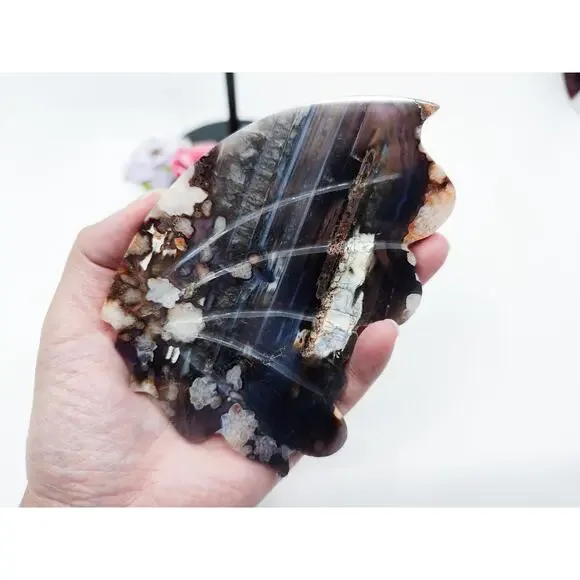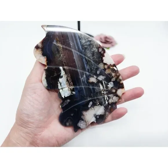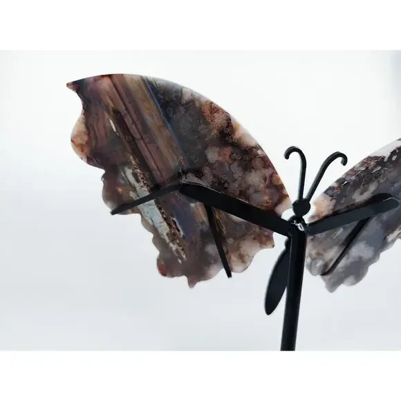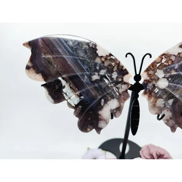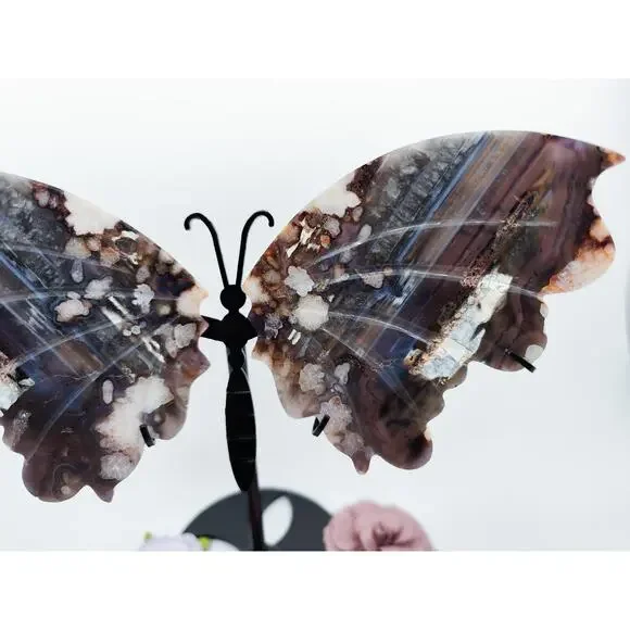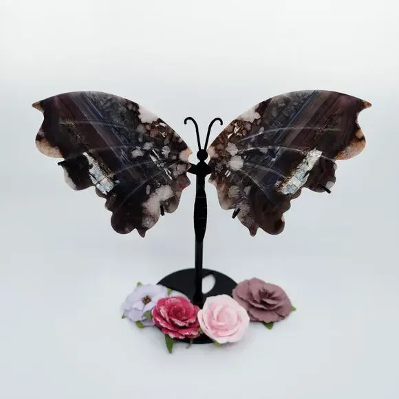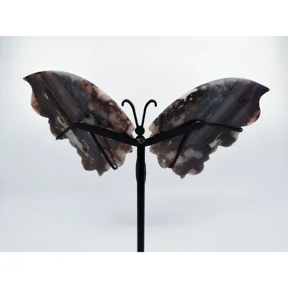 Unveil the Beauty of Blue Flower Agate:🌸 Emotional Healing and Growth: Blue Flower Agate is a gentle healer, promoting emotional healing and growth. Its soothing energy helps to release emotional blockages, encouraging self-acceptance and personal transformation.🌌 Spiritual Insight and Intuition: Enhance your spiritual journey with Blue Flower Agate. This stone amplifies intuition and deepens spiritual insight, connecting you to higher realms and inner wisdom.🌿 Calm and Balance: Experience the calming and balancing effects of Blue Flower Agate. It alleviates stress and anxiety, fostering a serene and balanced state of mind, and harmonizing the energies of the mind, body, and spirit.Each wing is about...5 inches tall3.5 inches wide115g eachPlease kindly note that you will receive a pair of butterfly wings on a stand. Each stone is unique and you can pick the one that calls to you the most! Since all carvings are made of natural material, please allow for some imperfections as they add to the character of the crystal! All crystals are cleansed before shipping by either sound bath or smoke.