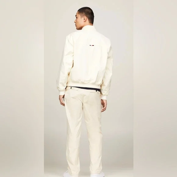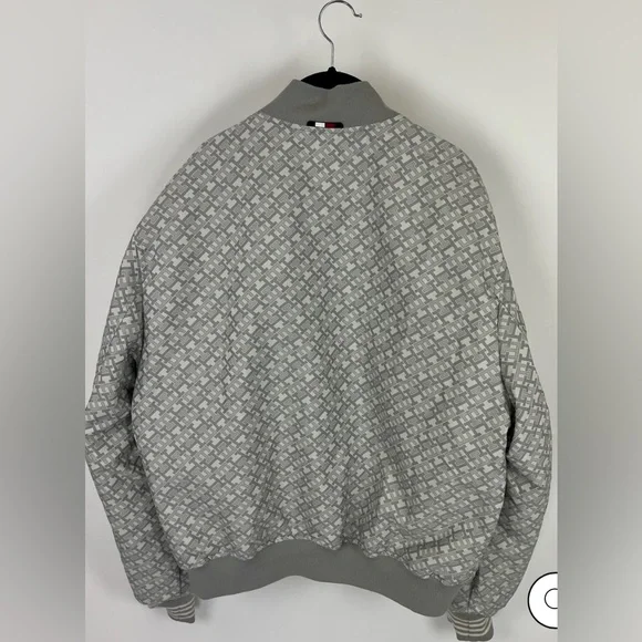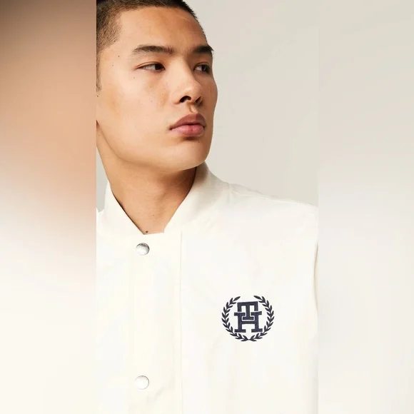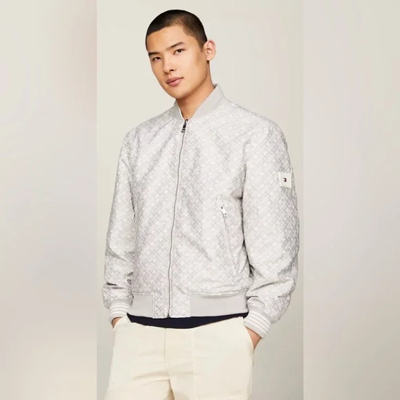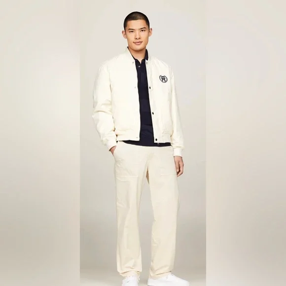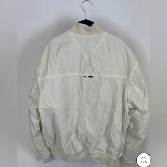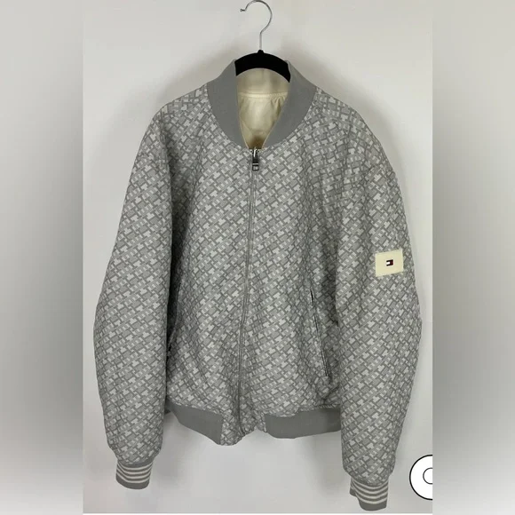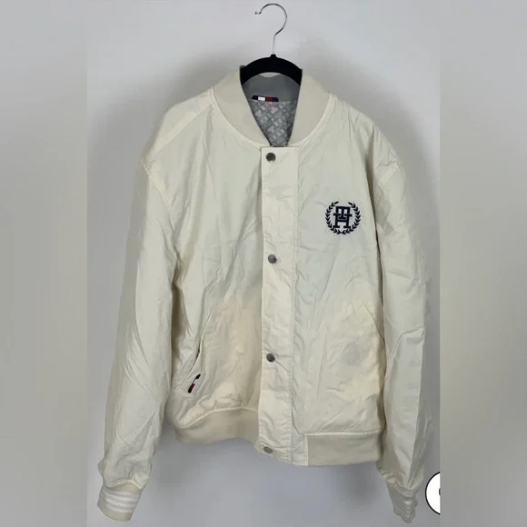 Stylish lightweight jacket. Features button closure. Iconic logo on chest.Oversized cream bomber jacketRibbed collarSilver front zipper Silver clasp buttons down the frontAn embroidered Tommy Hilfiger insignia on the left side Cream ribbed waistbandCan be reversed to reveal a T-H repeating patternGray ribbed collarFront pockets with a silver zipper closureRubber Tommy Hilfiger logo on the left side Gray ribbed waistbandTommy Hilfiger men's jacket. This reversible jacket offers two varsity-inspired styles in one silhouette, featuring a solid color on one side and an allover TH monogram motif on the other.Reversible, water resistant.Baseball collar, zip and snap closure.Side angled pockets.100% recycled nylon.Excellent used condition like newNo noted flawsFreshly laundered Smoke free home