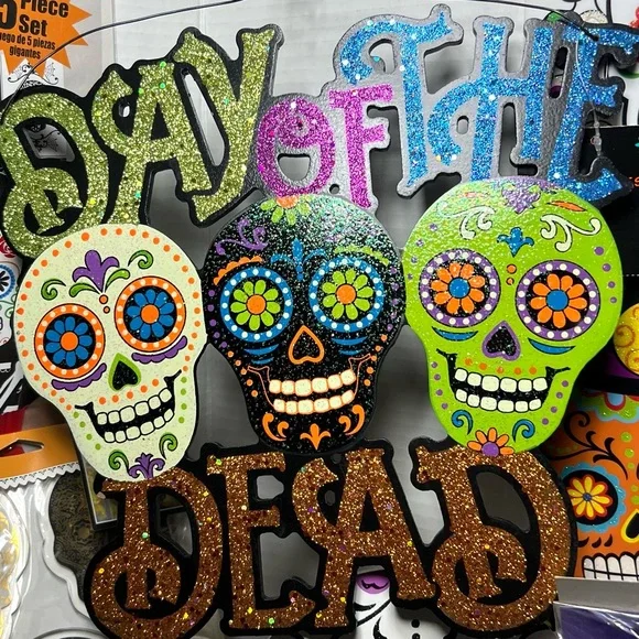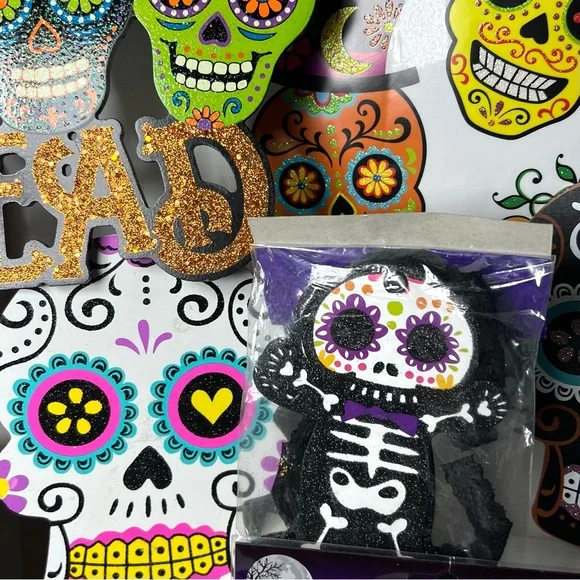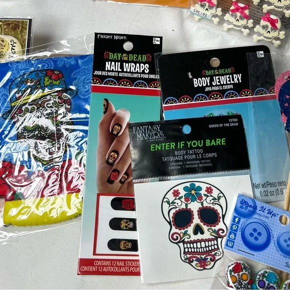 32 ITEM DAY OF THE DEAD THEMED GIFT SETALL BRAND NEWNEVER USED- Wooden Signs- XL Window Cling - Wall Decorating Kit- Folders- Coloring Book- Garland - Body Tattoos - Jewelry - Nail Wraps- Gel Window Clings- Pumpkin Bling - Pumpkin Cling- Party Bags- Stickers - Embellishments - Window Decorations - Sunglasses - Baking Cups- Shot Glasses- Buttons- Bracelet - Can Cooler- Cup Cake Picks
